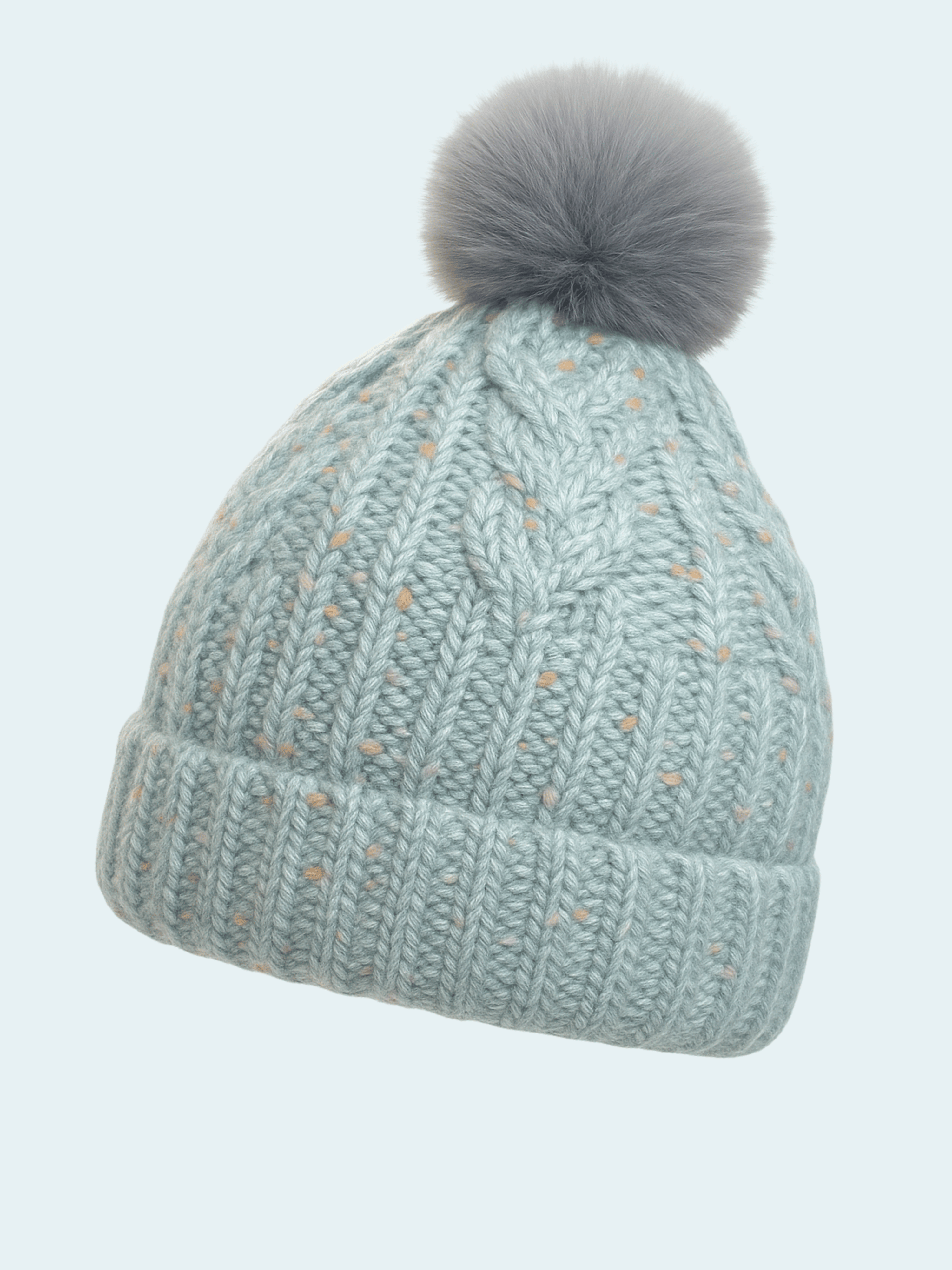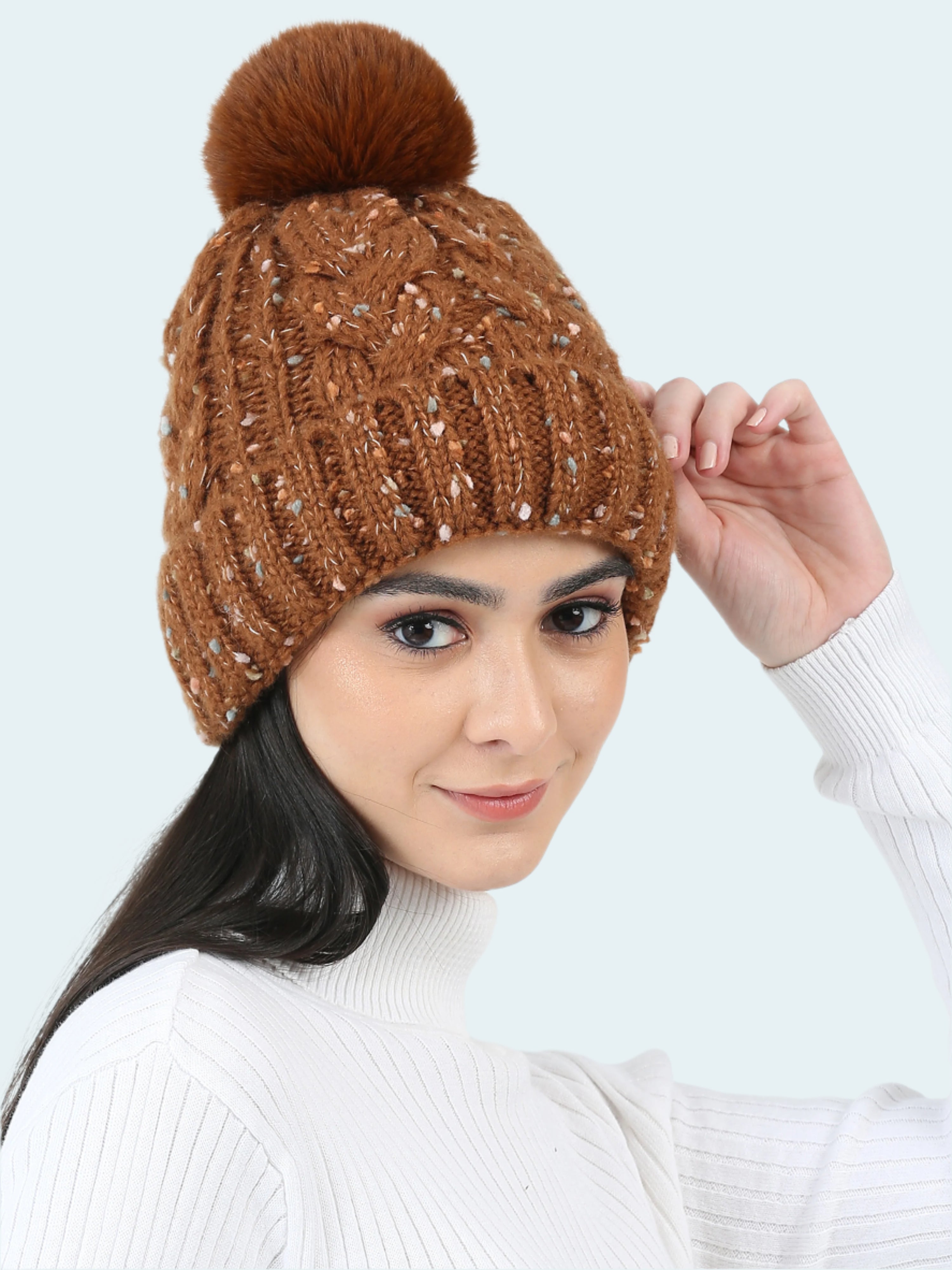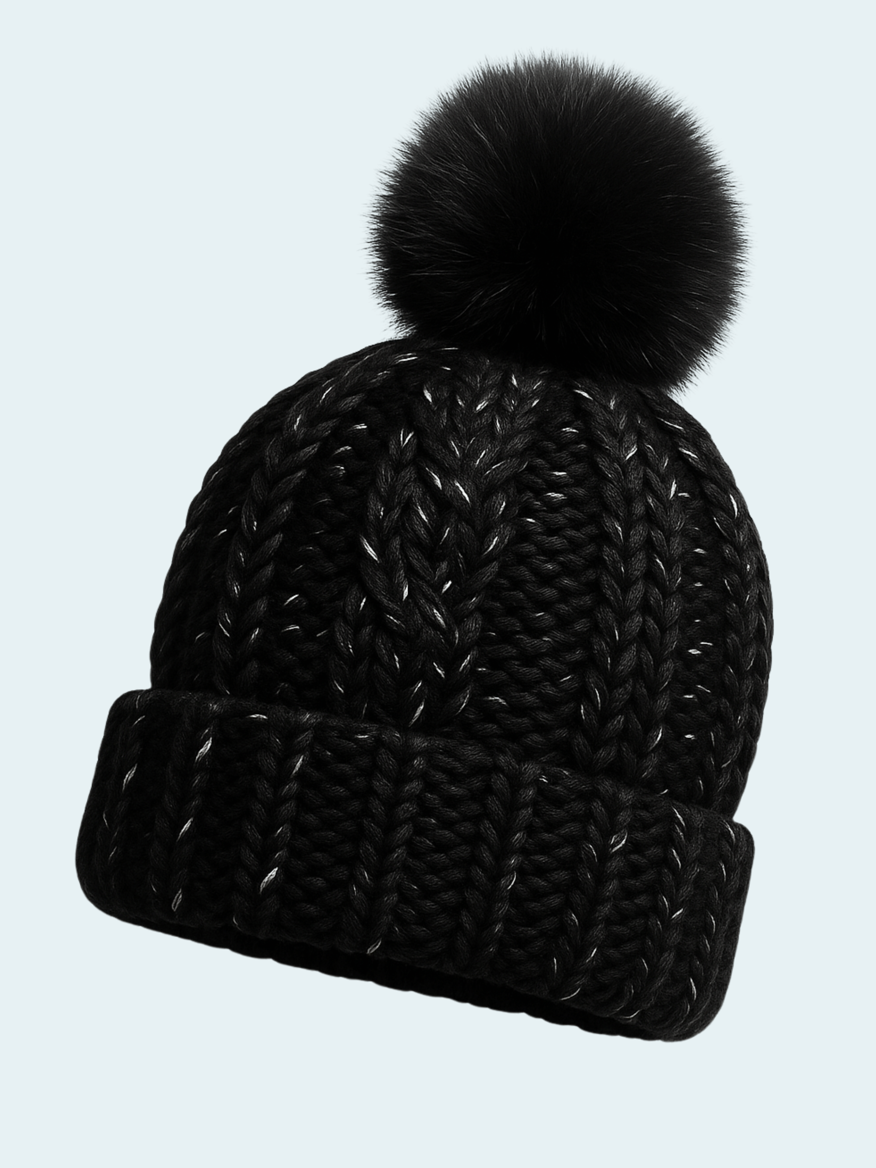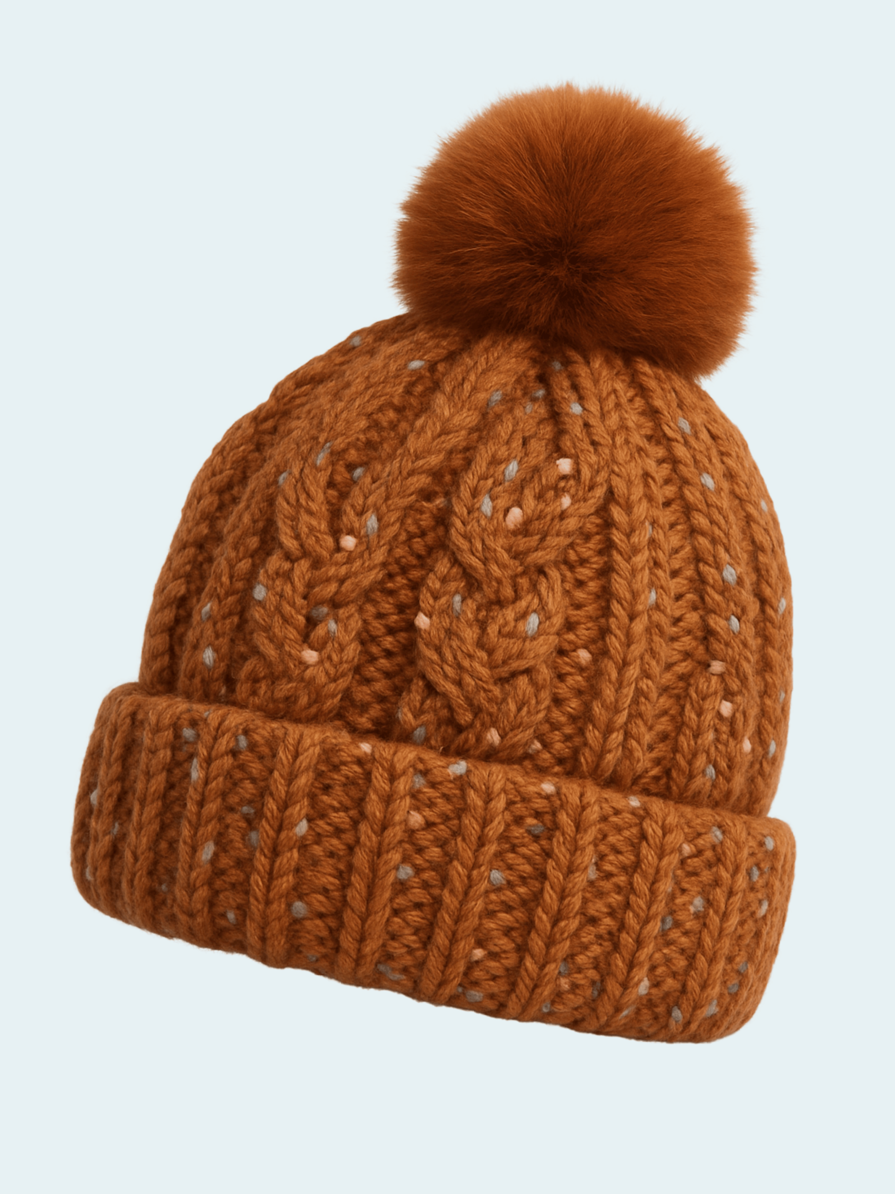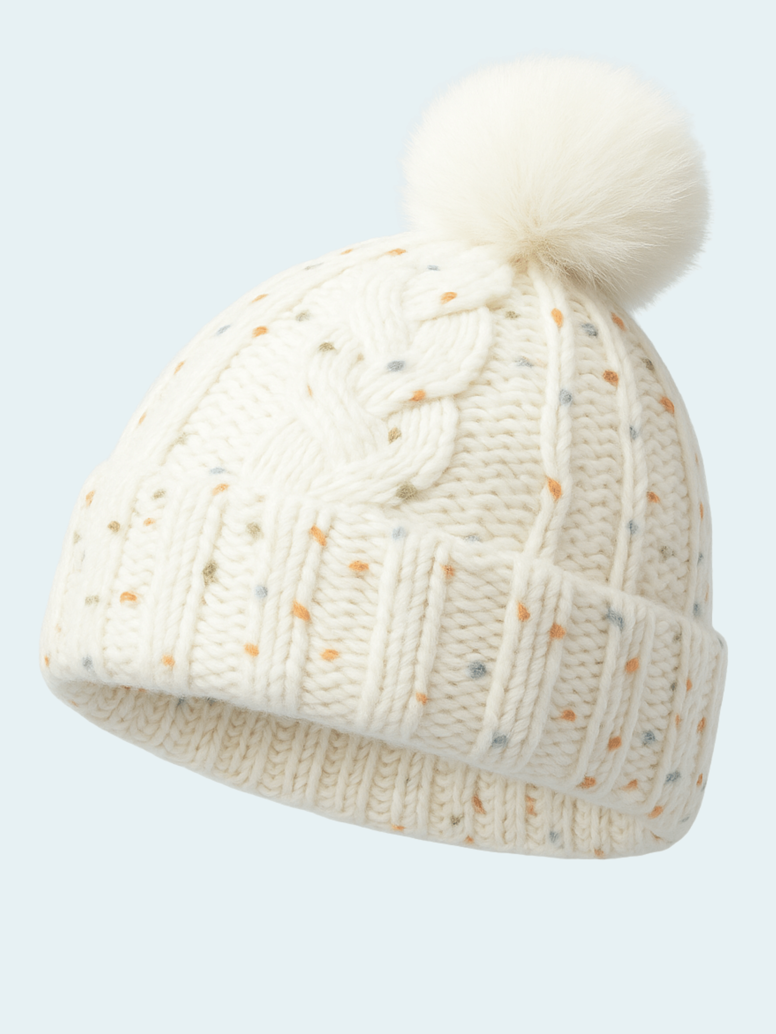 Stylish Cable Knit: Features a fleck twist cable-knit design with a playful pom-pom accent, adding a touch of charm to your cold-weather wardrobe.